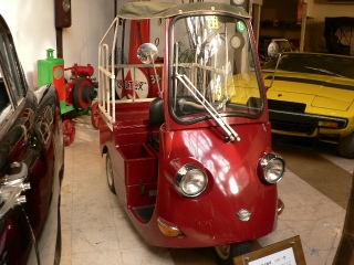 運転席に乗ってみると、ものすごく狭くて、座り心地は 悪かったです。感覚は大型自動二輪みたいだったカナ。。。 大型自動二輪に乗ったことはないけど・・・(^^; 安定が悪く、時折、横転していたそうです。