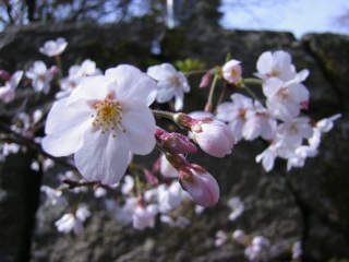 | 小高い山の上にあるお城までは、山の麓からリフト(ロープウェイもあります)で山の中腹まで行き、城内を歩きました。 “桜の名所”としても有名な松山城で今年初の桜見物。 満開と言えるまでには少し早く、5分咲きといった感じでした。 ここで驚いたのは、アジア系の観光客が実に多い事でした。右を向いても左を向いてもすれ違う人も韓国語。 日本でありながら、異国へ行ったような緊張感がありました。 |
