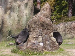 「チンパンジーがストローでジュースを飲みます...」 そんな園内放送が流れた。 “チンパンジーがジュースを飲む?ストローで??” とても興味を持った。 園内をすでに半周した所にいた私たちは急いで戻った。チンパンジーがいたのは、今まで歩いてきた距離を半分ほど戻らなければいけなかった。 それでもチンパンジーがストローでジュースを飲む姿を見たかった。 チンパンジーがいる前まで戻ると、そこには数組の見物客と飼育係の人がいた。 係の人の解説を聞きながら見物した。 |